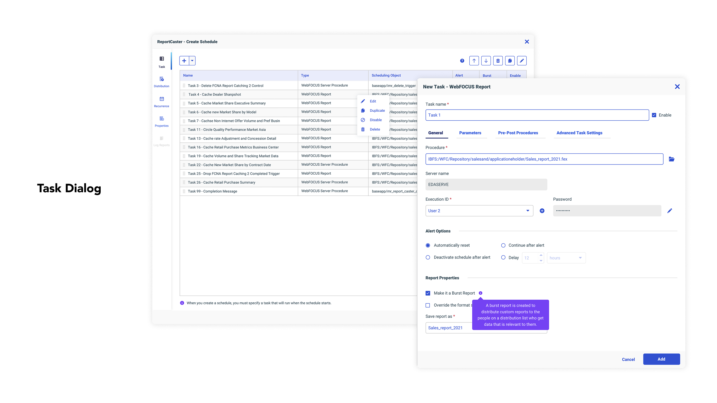 - Start from a report in the WebFOCUS hub and launch scheduling without leaving context.